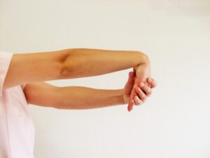 ・肘を伸ばした状態で、手首を手のひら側に曲げます。