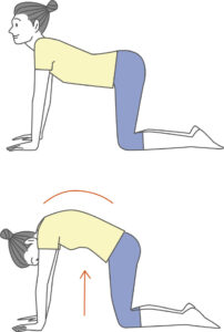 四つん這いの姿勢になり、息を吸いながら背中を反らし、頭を上げます(カウポーズ)。次に息を吐きながら背中を丸め、顎を引きます(キャットポーズ)。この動作をゆっくり10回繰り返しましょう。