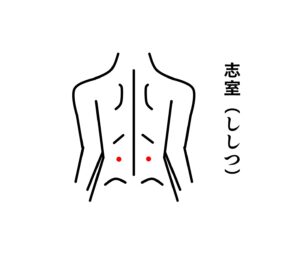 からだの背中側でおへそと同じ高さ、背骨の指2本分外。
