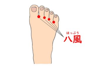 八風は足指の間にあるツボで、足の冷えに即効性があります。